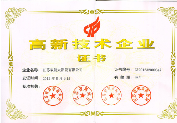 日前,江蘇雙能太陽能有限公司又傳喜訊,雙能公司榮獲由江蘇省科學技術廳、江蘇省財政廳、江蘇省國家稅務局、江蘇省地方稅務局聯(lián)合頒發(fā)的“高新技術企業(yè)”證書。