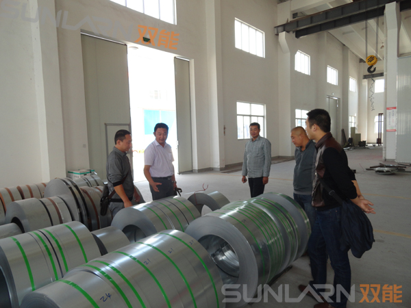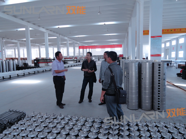 雙能常務副總賁道發帶領客戶參觀了雙能的生產車間。從原材料、工藝設備、包裝輸送等,賁總都進行了詳細地講解。支架熱鍍鋅鋼板采用大板料而非鋼帶料,讓客戶真切地感受到了雙能踏踏實實做企業的風格;連續式靜電噴涂線、水桶自動懸掛輸送線、真空管排氣臺等先進的設備,讓客戶對雙能的生產水平有了更深一步的了解,對雙能的產品質量更有信心。