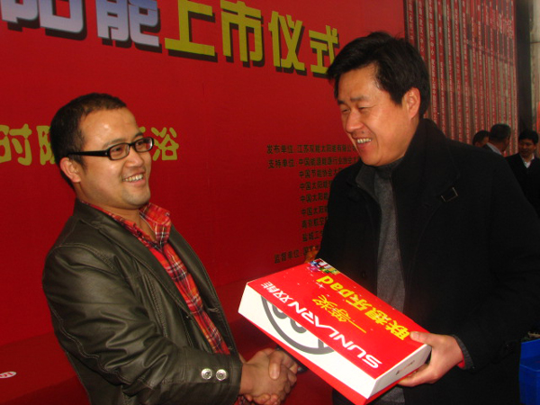 江蘇雙能太陽能有限公司在本次博覽會隆重舉行了“全球第一套智動波太陽能”上市啟動儀式。中國節能協會太陽能專業委員會秘書長霍志臣、全國太陽能標準化技術委員會秘書長賈鐵鷹、國家太陽能熱水器產品質量監督檢驗(北京)中心主任何濤、國家太陽能熱水器產品質量監督檢驗(武漢)中心總工張曉黎、江蘇雙能太陽能有限公司常務副總賁道發、以及湖南衛視、長沙電視臺、中國科技日報、中國能源報、人民網、新浪網、中國房地產報、《中國太陽能產業資訊》、《中國太陽能工程》、《太陽能》、《太陽界》等幾十家媒體,共同見證代表著太陽能行業“再節能”集成技術領域前沿成果的“智動波太陽能”新品全球上市儀式及現場演示體驗活動。