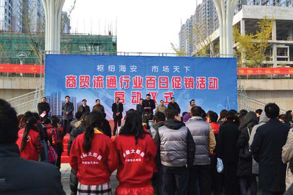 為全面貫徹落實江蘇省政府召開的加快流通業(yè)現(xiàn)代化工作會議精神,進(jìn)一步挖掘社會消費力,提升消費信心,促進(jìn)內(nèi)需增長,海安商務(wù)局特主辦“樞紐海安 市場天下”商貿(mào)行業(yè)百日促銷活動,開幕儀式于12月2日在人民廣場隆重舉行。