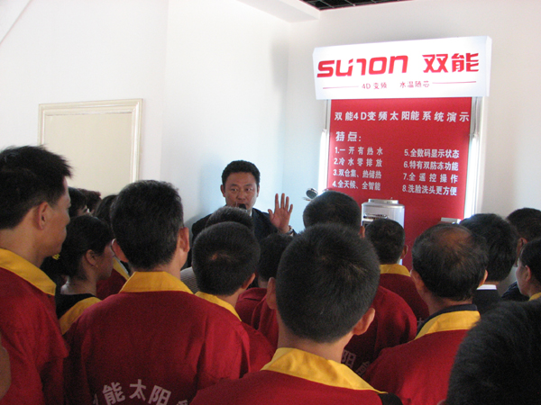 最后參觀的是最讓大家期待的雙能新產(chǎn)品4D變頻太陽能,為了讓大家全面了解新產(chǎn)品的技術(shù)特征、功能原理,雙能總經(jīng)理賁道發(fā)親自上陣,在公司展廳為大家介紹了4D變頻太陽能并現(xiàn)場進行演示。一位經(jīng)銷商表示,四川因為雨霧天氣較多,有了雙能4D變頻太陽能熱水器,困擾了好多年的問題終于有辦法解決了。此外,不少經(jīng)銷商還在現(xiàn)場就預(yù)訂了多臺4D變頻太陽能熱水器。