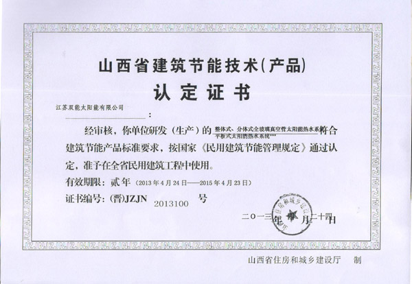 雙能獲得該證書,證明雙能太陽能產(chǎn)品符合與該種產(chǎn)品有關(guān)的質(zhì)量、安全和環(huán)境保護等方面的標準要求,與同類產(chǎn)品或相同功能的產(chǎn)品相比,效率或能耗指標達到省及省以上先進水平,且在山西省之后的建筑應用中,會被優(yōu)先推廣。該證書的獲得,對雙能產(chǎn)品在山西省的推廣起到了積極的推進作用,也為消費者選購太陽能提供了一個更為放心的選擇。