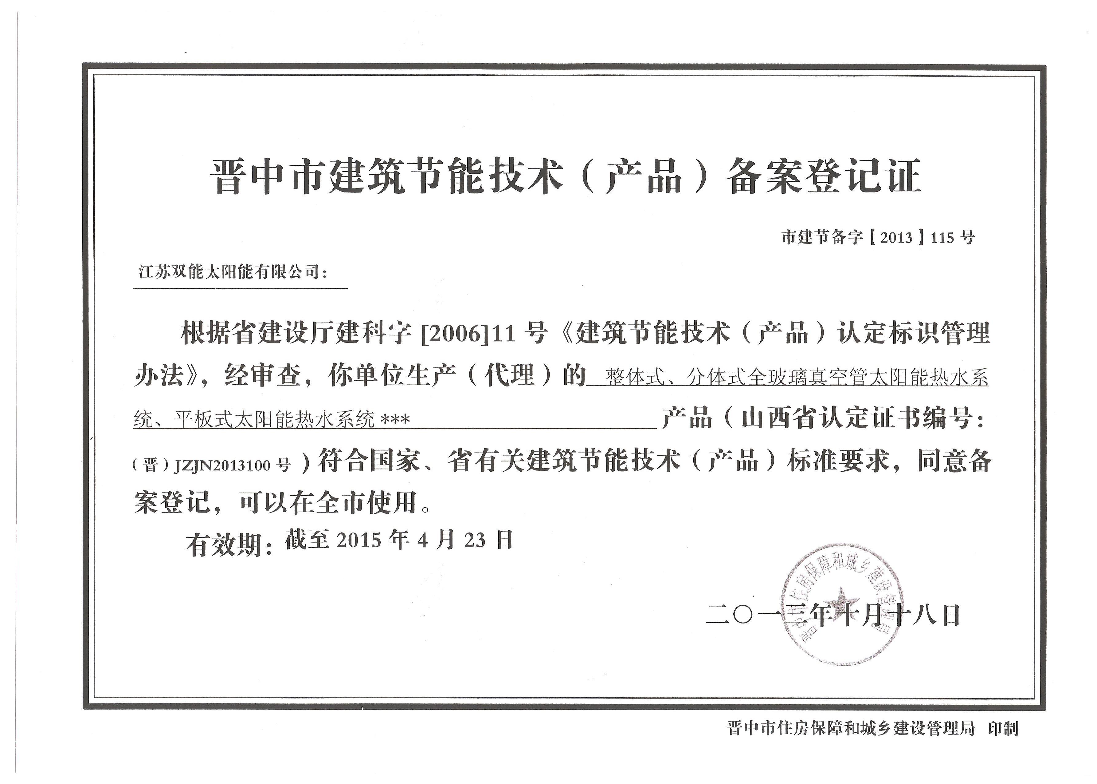 雙能太陽能獲晉中市建筑節(jié)能產(chǎn)品推廣證